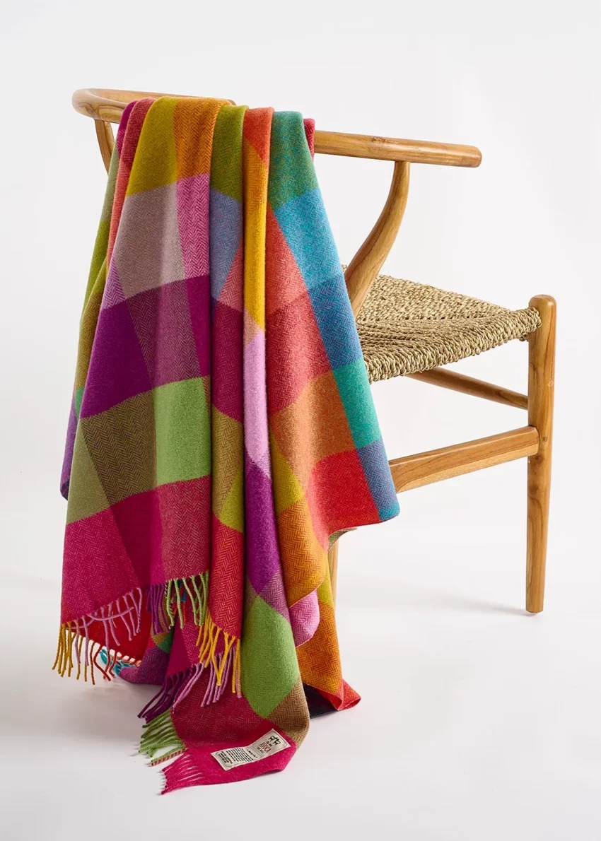 Eine leichte Lambswooldecke kombiniert das klassische Fischgrätmuster und große Karos. Made in Ireland.