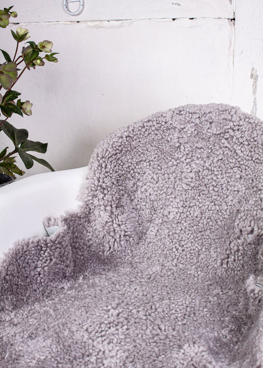 Ein echtes Curly Lammfell, ideal für eine lange Gartenbank oder Liege sehr strapazierfähig und durabel, grau, weiches Wollvliess Naturlocke, Wollhöhe ca. 2 cm. Unsere Curly-Lammfelle gibt es in zwei Größen: M (90 x 60 cm) und L (120 x 65 /70 cm) und vier Standardfarben. Dunkeltaupe/braun, leinen, grau-saphir und hellgrau.