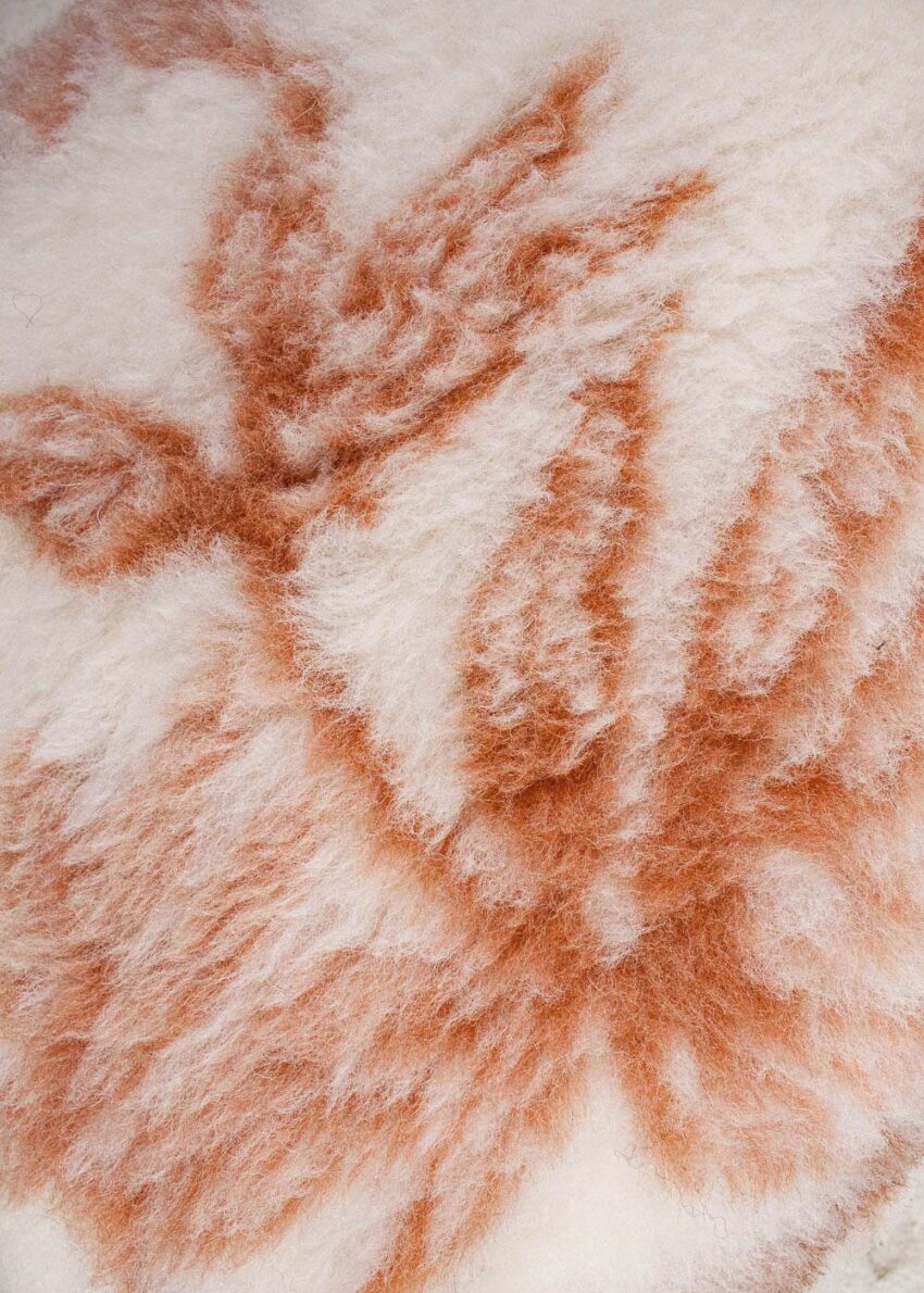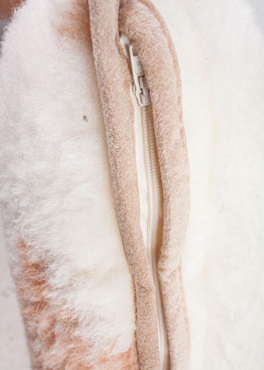 Schurwollkissen für Bett, Sofa oder Sessel. Die Rückseite des Lammfell-Kissens ist naturfarbend.